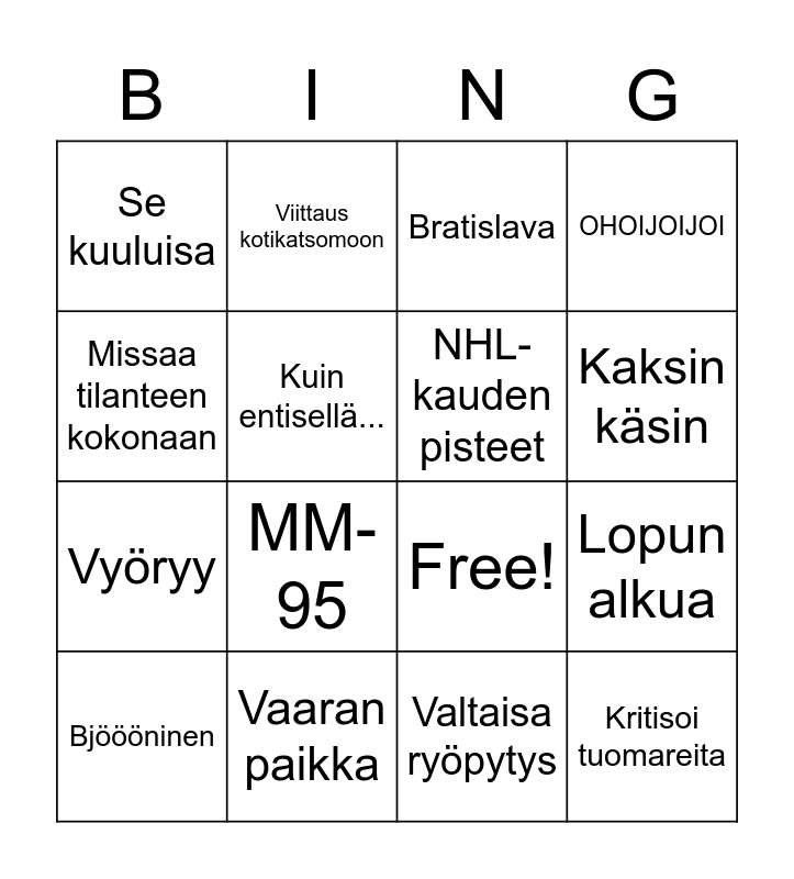 This bingo card has 21 words: Vaaran paikka, Myrsky- varoitus, Viittaus kotikatsomoon, Viittaus katsomoon, Valtaisa ryöpytys, NHL- kauden pisteet, Se kuuluisa, Bratislava, Free!, Kaksin käsin, Vyöryy, OHOIJOIJOI, Kritisoi tuomareita, Kokenut hyökkääjä, Kuin entisellä..., Kutsuu pelaajaa väärällä nimellä, Bjöööninen, MM-95, Missaa tilanteen kokonaan, Lopun alkua and Arvoturnaus.