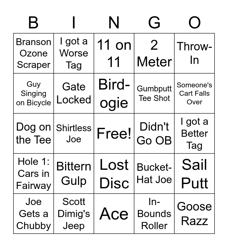 This bingo card has a free space and 24 words: Bittern Gulp, Scott Dimig's Jeep, Bird-ogie, Joe Gets a Chubby, Throw-In, Branson Ozone Scraper, Guy Singing on Bicycle, I got a Worse Tag, Didn't Go OB, Lost Disc, Gumbputt Tee Shot, Dog on the Tee, Bucket-Hat Joe, Sail Putt, Gate Locked, In-Bounds Roller, I got a Better Tag, 11 on 11, Someone's Cart Falls Over, Shirtless Joe, Goose Razz, Hole 1: Cars in Fairway, 2 Meter and Ace.