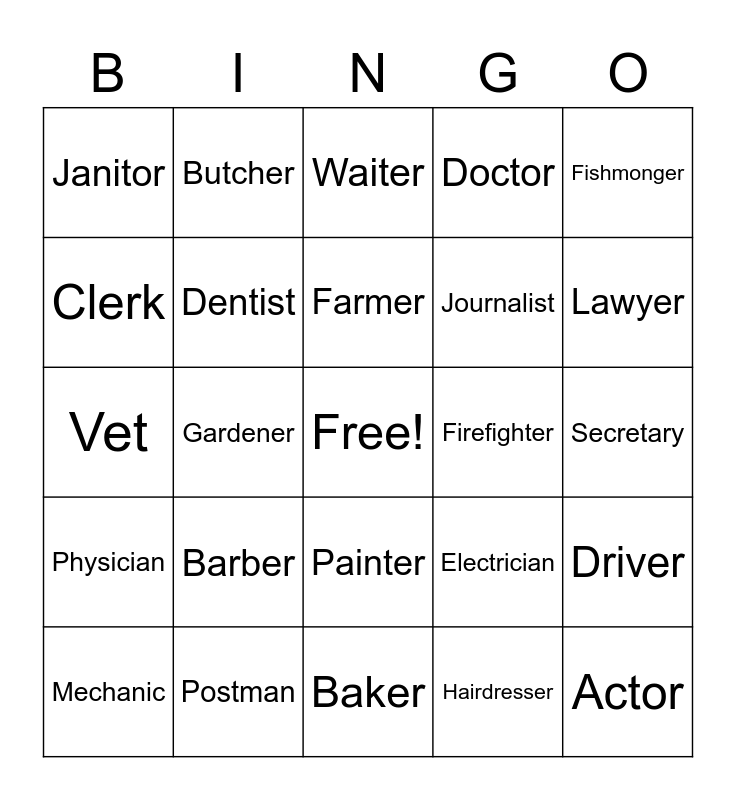 This bingo card has a free space and 49 words: Accountant, Actor, Architect, Baker, Barber, Bricklayer, Butcher, Chef, Clerk, Cook, Dentist, Doctor, Driver, Electrician, Engineer, Estate agent, Farmer, Firefighter, Fisherman, Fishmonger, Gardener, Hairdresser, Janitor, Journalist, Judge, Lawyer, Mechanic, Nurse, Painter, Physician, Pilot, Plumber, Policeman, Politician, Postman, Professor, Salesperson, Scientist, Secretary, Singer, Soldier, Tailor, Teacher, Travel agent, Vet, Waiter, Waiteress, Worker and Writer.