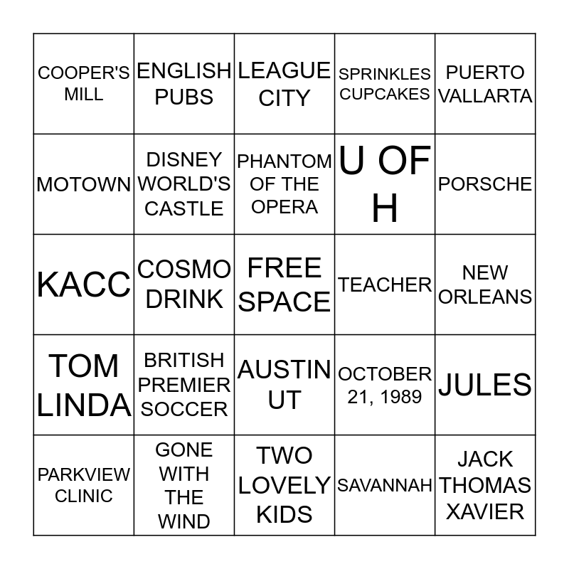 This bingo card has a free space and 24 words: BRITISH PREMIER SOCCER, GONE WITH THE WIND, PHANTOM OF THE OPERA, PARKVIEW CLINIC, PUERTO VALLARTA, COOPER'S MILL, MOTOWN, ENGLISH PUBS, TEACHER, AUSTIN UT, U OF H, KACC, OCTOBER 21, 1989, JULES, DISNEY WORLD'S CASTLE, SAVANNAH, NEW ORLEANS, LEAGUE CITY, PORSCHE, COSMO DRINK, JACK THOMAS XAVIER, TOM LINDA, SPRINKLES CUPCAKES and TWO LOVELY KIDS.