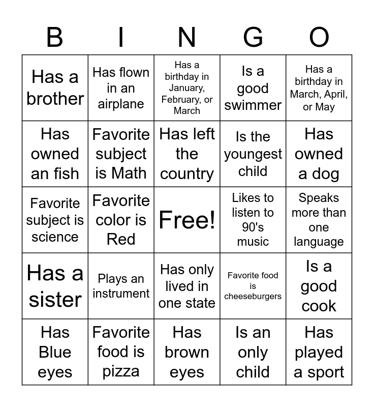 This bingo card has a free space and 29 words: Has Blue eyes, Has owned a cat, Favorite color is Red, Has lived in another state, Has a brother, Has a birthday in January, February, or March, Favorite subject is Math, Plays an instrument, Likes to listen to 90's music, Favorite food is pizza, Speaks more than one language, Has played a sport, Has brown eyes, Is an only child, Has owned a dog, Favorite color is blue, Has only lived in one state, Has a sister, Has a birthday in March, April, or May, Favorite subject is science, Favorite food is cheeseburgers, Has green/hazel eyes, Is the youngest child, Has owned an fish, Is a good swimmer, Has flown in an airplane, Is a good cook, Has left the country and Is left handed.