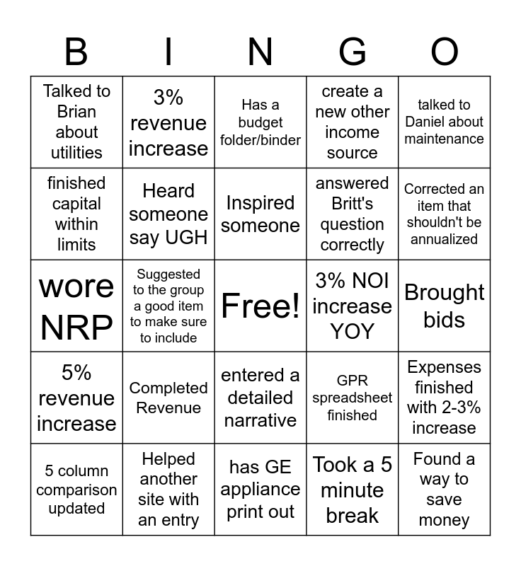 This bingo card has a free space and 24 words: Completed Revenue, Helped another site with an entry, Inspired someone, 5 column comparison updated, talked to Daniel about maintenance, Talked to Brian about utilities, finished capital within limits, 3% revenue increase, 3% NOI increase YOY, entered a detailed narrative, answered Britt's question correctly, wore NRP, GPR spreadsheet finished, Expenses finished with 2-3% increase, Heard someone say UGH, Took a 5 minute break, Brought bids, Has a budget folder/binder, Corrected an item that shouldn't be annualized, Suggested to the group a good item to make sure to include, Found a way to save money, 5% revenue increase, create a new other income source and has GE appliance print out.