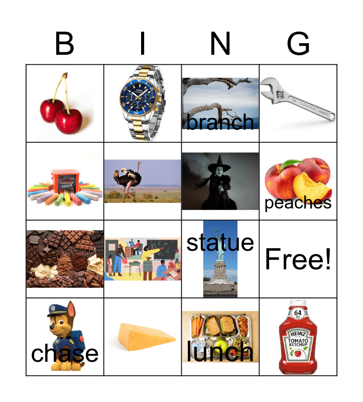 This bingo card has 19 images and 7 words: Free!, branch, chase, statue, furniture, peaches and lunch.
