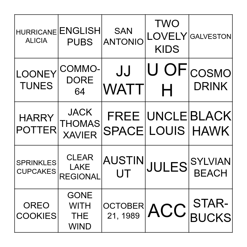 This bingo card has a free space and 24 words: CLEAR LAKE REGIONAL, GONE WITH THE WIND, JJ WATT, OREO COOKIES, GALVESTON, HURRICANE ALICIA, LOONEY TUNES, ENGLISH PUBS, UNCLE LOUIS, AUSTIN UT, U OF H, HARRY POTTER, JULES, SYLVIAN BEACH, COMMO-DORE 64, ACC, BLACK HAWK, SAN ANTONIO, COSMO DRINK, JACK THOMAS XAVIER, STAR- BUCKS, SPRINKLES CUPCAKES, TWO LOVELY KIDS and OCTOBER 21, 1989.