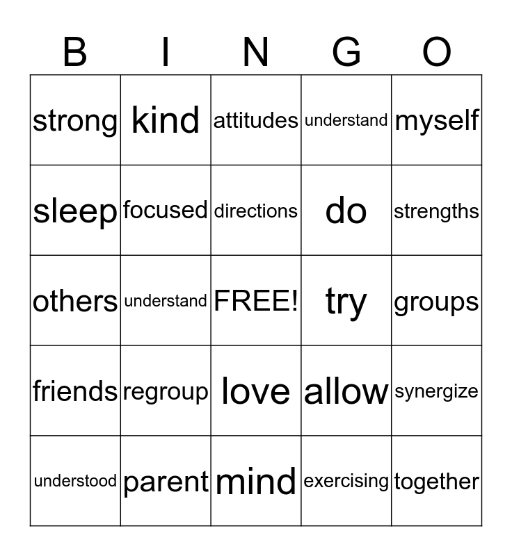 This bingo card has a free space and 72 words: solve, kind, understand, I, me, you, understand, feelings, do, better, understood, well, strengths, strong, work, others, allow, myself, them, groups, regroup, together, synergize, people, value, learning Tree, lead, leader, done, work, parent, balance, how, care, exercising, eat, right, family, sleep, sharpen, love, school, teach, teacher, kids, friends, students, classroom, saw, plan, proactive, everything, charge, try, always, moods, attitudes, directions, plan, choice, future, prepared, end, mind, things, distractions, focused, do, love, fun, happy and friends.