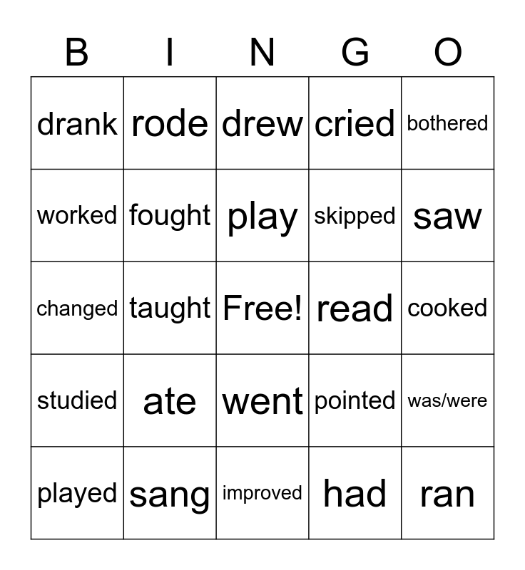 This bingo card has a free space and 24 words: ate, sang, play, played, bothered, drank, worked, rode, read, went, skipped, changed, pointed, was/were, fought, had, cooked, drew, saw, taught, ran, studied, cried and improved.