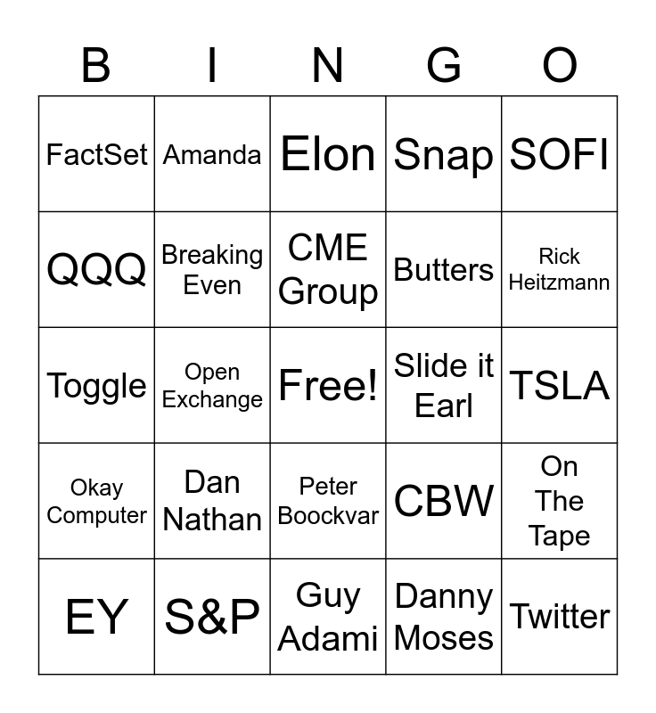 This bingo card has a free space and 24 words: Dan Nathan, S&P, CME Group, EY, SOFI, FactSet, QQQ, Amanda, Slide it Earl, Peter Boockvar, Butters, Toggle, CBW, On The Tape, Breaking Even, Danny Moses, TSLA, Elon, Rick Heitzmann, Open Exchange, Twitter, Okay Computer, Snap and Guy Adami.