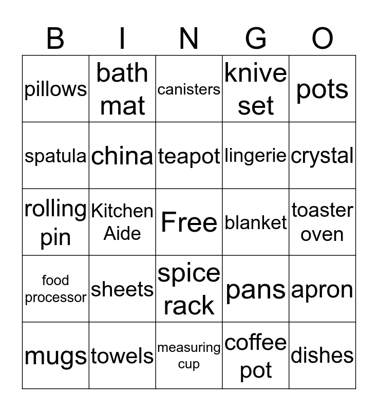 This bingo card has a free space and 24 words: sheets, towels, teapot, mugs, pots, pillows, spatula, bath mat, blanket, spice rack, lingerie, rolling pin, pans, apron, china, coffee pot, toaster oven, canisters, crystal, Kitchen Aide, dishes, food processor, knive set and measuring cup.