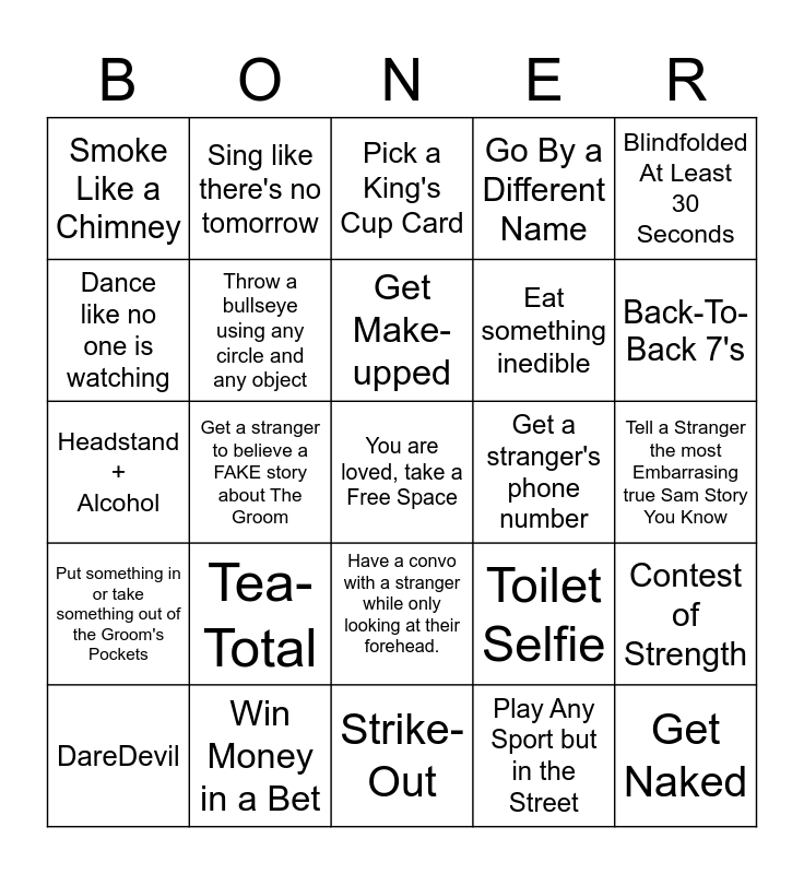 This bingo card has a free space and 24 words: Tea-Total, Win Money in a Bet, Get Make-upped, DareDevil, Blindfolded At Least 30 Seconds, Smoke Like a Chimney, Dance like no one is watching, Sing like there's no tomorrow, Get a stranger's phone number, Have a convo with a stranger while only looking at their forehead., Eat something inedible, Headstand + Alcohol, Toilet Selfie, Contest of Strength, Throw a bullseye using any circle and any object, Play Any Sport but in the Street, Tell a Stranger the most Embarrasing true Sam Story You Know, Pick a King's Cup Card, Back-To-Back 7's, Get a stranger to believe a FAKE story about The Groom, Get Naked, Put something in or take something out of the Groom's Pockets, Go By a Different Name and Strike-Out.