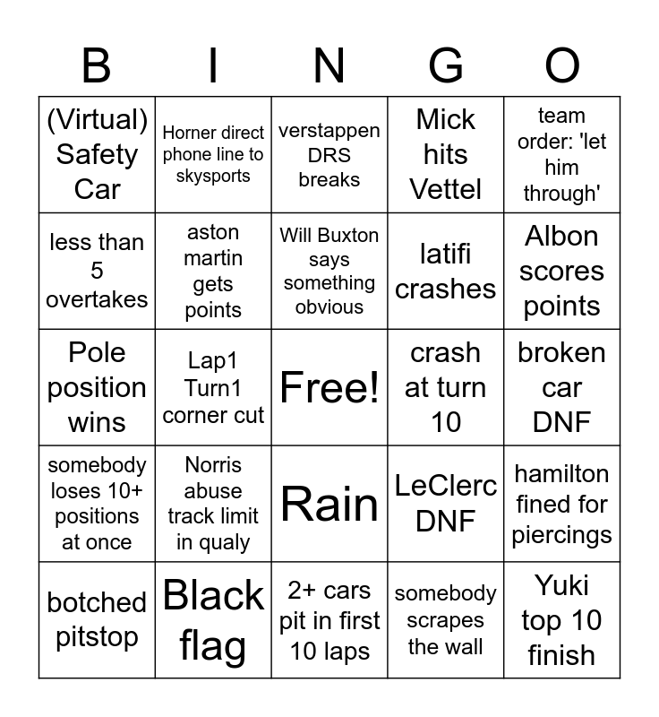 This bingo card has a free space and 24 words: Norris abuse track limit in qualy, Black flag, Will Buxton says something obvious, botched pitstop, team order: 'let him through', (Virtual) Safety Car, less than 5 overtakes, Horner direct phone line to skysports, crash at turn 10, Rain, latifi crashes, Pole position wins, LeClerc DNF, hamilton fined for piercings, aston martin gets points, somebody scrapes the wall, broken car DNF, verstappen DRS breaks, Albon scores points, Lap1 Turn1 corner cut, Yuki top 10 finish, somebody loses 10+ positions at once, Mick hits Vettel and 2+ cars pit in first 10 laps.