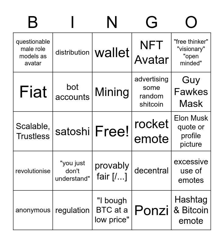 This bingo card has a free space and 24 words: "you just don't understand", regulation, Mining, anonymous, "free thinker" "visionary" "open minded", questionable male role models as avatar, Fiat, distribution, rocket emote, provably fair [/...], advertising some random shitcoin, Scalable, Trustless, decentral, excessive use of emotes, bot accounts, Ponzi, Elon Musk quote or profile picture, wallet, Guy Fawkes Mask, satoshi, Hashtag & Bitcoin emote, revolutionise, NFT Avatar and "I bough BTC at a low price".