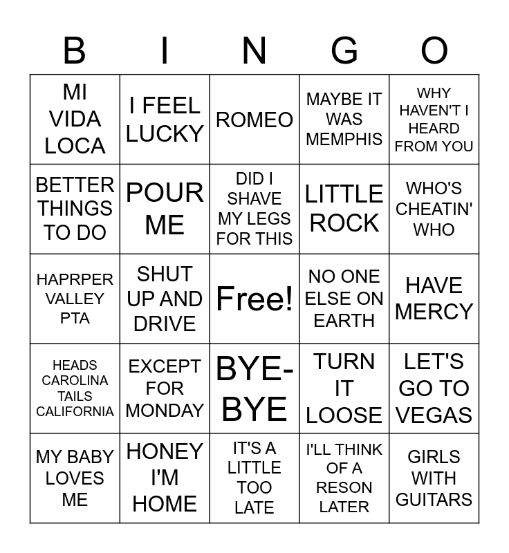 This bingo card has a free space and 47 words: CLEOPATRA QUEEN OF DENIAL, GIRLS WITH GUITARS, I'M THAT KIND OF GIRL, IT'S A LITTLE TOO LATE, EXCEPT FOR MONDAY, I TRY TO THINK ABOUT ELVIS, I FEEL LUCKY, SOME KIND OF TROUBLE, BETTER THINGS TO DO, DOWN AT THE TWIST & SHOUT, POUR ME, MAYBE IT WAS MEMPHIS, LET'S GO TO VEGAS, TURN IT LOOSE, SINGLE WHITE FEMALE, GUYS DO IT ALL THE TIME, DID I SHAVE MY LEGS FOR THIS, NO ONE ELSE ON EARTH, A GIRL'S GOTTA DO (WHAT A GIRL'S GOTTA DO), WHY HAVEN'T I HEARD FROM YOU, SHUT UP AND DRIVE, I'LL THINK OF A RESON LATER, MI VIDA LOCA, LITTLE ROCK, TELL ME WHY, WHO'S CHEATIN' WHO, MY BABY LOVES ME, EIGHTEEN WHEELS AND A DOZEN ROSES, BYE-BYE, HEADS CAROLINA TAILS CALIFORNIA, IT'S A HEARTACHE, ONE WAY TICKET, WHOSE BED HAVE YOUR BOOTS BEEN UNDER, LESSON IN LEAVIN', JOSE CUERVO, HONEY I'M HOME, HAVE MERCY, WHY HAVE YOU LEFT THE ONE YOU LEFT ME FOR, FANCY, ICAN LOVE YOU BETTER, NOBODY, ROMEO, HAPRPER VALLEY PTA, DELTA DAWN, THIS ONE FOR THE GIRLS, CAN'T EVEN GET THE BLUES and GUNPOWDER & LEAD.