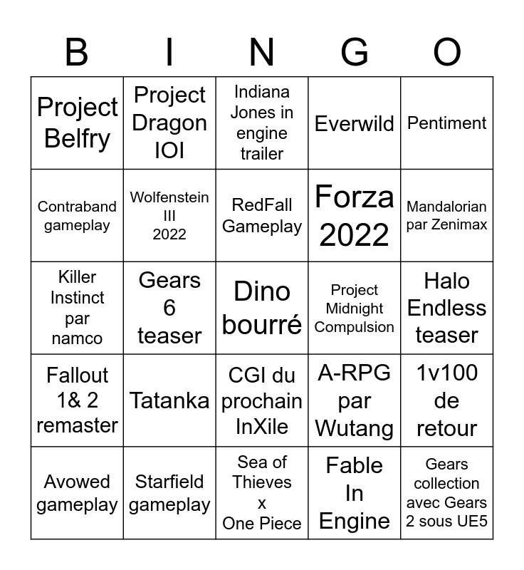 This bingo card has a free space and 24 words: Tatanka, Starfield gameplay, RedFall Gameplay, Avowed gameplay, Pentiment, Project Belfry, Contraband gameplay, Project Dragon IOI, Project Midnight Compulsion, CGI du prochain InXile, Forza 2022, Killer Instinct par namco, A-RPG par Wutang, 1v100 de retour, Wolfenstein III 2022, Fable In Engine, Halo Endless teaser, Indiana Jones in engine trailer, Mandalorian par Zenimax, Gears 6 teaser, Gears collection avec Gears 2 sous UE5, Fallout 1& 2 remaster, Everwild and Sea of Thieves x One Piece.