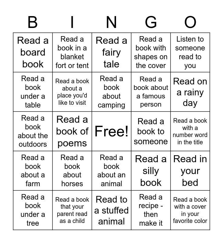 This bingo card has a free space and 24 words: Read a book about horses, Read a book that your parent read as a child, Read a book about camping, Read a book under a tree, Listen to someone read to you, Read a board book, Read a book under a table, Read a book in a blanket fort or tent, Read a book to someone, Read a book about an animal, Read a book about a famous person, Read a book about the outdoors, Read a silly book, Read in your bed, Read a book about a place you'd like to visit, Read a recipe - then make it, Read a book with a number word in the title, Read a fairy tale, Read on a rainy day, Read a book of poems, Read a book with a cover in your favorite color, Read a book about a farm, Read a book with shapes on the cover and Read to a stuffed animal.