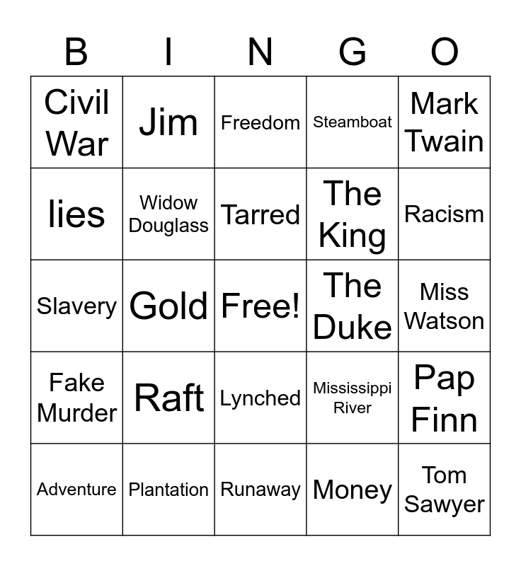 This bingo card has a free space and 24 words: Raft, Plantation, Tarred, Adventure, Mark Twain, Civil War, lies, Jim, The Duke, Lynched, The King, Slavery, Mississippi River, Pap Finn, Widow Douglass, Money, Miss Watson, Freedom, Racism, Gold, Tom Sawyer, Fake Murder, Steamboat and Runaway.