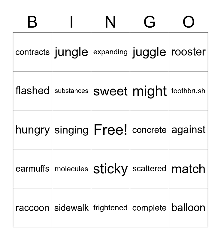 This bingo card has a free space and 29 words: raccoon, plane, singing, playmate, contracts, expanding, substances, molecules, concrete, sidewalk, against, balloon, frightened, complete, toothbrush, mistake, sticky, earmuffs, rooster, hungry, scattered, animals, might, flashed, juggle, jungle, match, sweet and sweat.