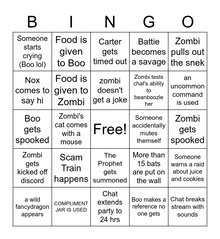This bingo card has a free space and 24 words: Scam Train happens, COMPLIMENT JAR IS USED, zombi doesn't get a joke, a wild fancydragon appears, Zombi pulls out the snek, Someone starts crying (Boo lol), Nox comes to say hi, Food is given to Boo, Someone accidentally mutes themself, The Prophet gets summoned, Zombi tests chat's ability to beanboozle her, Boo gets spooked, More than 15 bats are put on the wall, Someone warns a raid about juice and cookies, Food is given to Zombi, Boo makes a reference no one gets, Zombi gets spooked, Carter gets timed out, an uncommon command is used, Zombi's cat comes with a mouse, Chat breaks stream with sounds, Zombi gets kicked off discord, Battie becomes a savage and Chat extends party to 24 hrs.