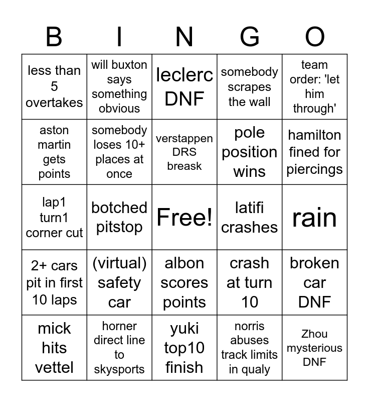 This bingo card has a free space and 24 words: (virtual) safety car, horner direct line to skysports, verstappen DRS breask, mick hits vettel, team order: 'let him through', less than 5 overtakes, aston martin gets points, will buxton says something obvious, latifi crashes, albon scores points, pole position wins, lap1 turn1 corner cut, crash at turn 10, broken car DNF, somebody loses 10+ places at once, norris abuses track limits in qualy, rain, leclerc DNF, hamilton fined for piercings, botched pitstop, Zhou mysterious DNF, 2+ cars pit in first 10 laps, somebody scrapes the wall and yuki top10 finish.