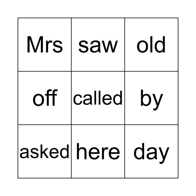 This bingo card has 15 words: made, if, old, Mrs, here, called, put, house, by, day, time, off, asked, saw and help.