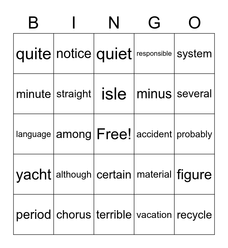 This bingo card has a free space and 29 words: period, about, among, beginning, quite, quiet, straight, although, accident, chorus, probably, recycle, terrible, vacation, several, continue, certain, yacht, system, language, material, length, minus, minute, responsible, notice, figure, isle and example.
