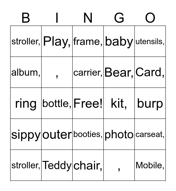 This bingo card has a free space and 97 words: walker, ,, bibs,, bottle,, bassinet,, crib,, glider,, humidifer,, Diaper, Rash, cream,, diapers,, pacifier,, sippy, cup,, stroller,, utensils,, wash, clothes,, hooded, towels,, bath, robe,, mittens,, baby, carrier,, stroller,, carseat,, Baby, powder, ,, baby, tub,, High, chair,, booties,, baby, socks,, teething, ring, ,, burp, clothes, ,, outer, wear, ,, onesie,, diaper, bag,, receiving, blanket,, Play, gym,, boppy,, Pack, &, Play,, Baby, Book,, wipes,, sleep, sack,, swaddler,, rubber, ducks, ,, Baby, sling,, Teddy, Bear,, bouncer,, baby, hat,, changing, pad,, first, aid, kit,, q-tips,, Gift, Card,, Baby, Monitor,, Baby, lotion,, Mobile,, Crib, Sheets,, Picture, frame,, Piggy, Bank,, photo, album,, changing and table.