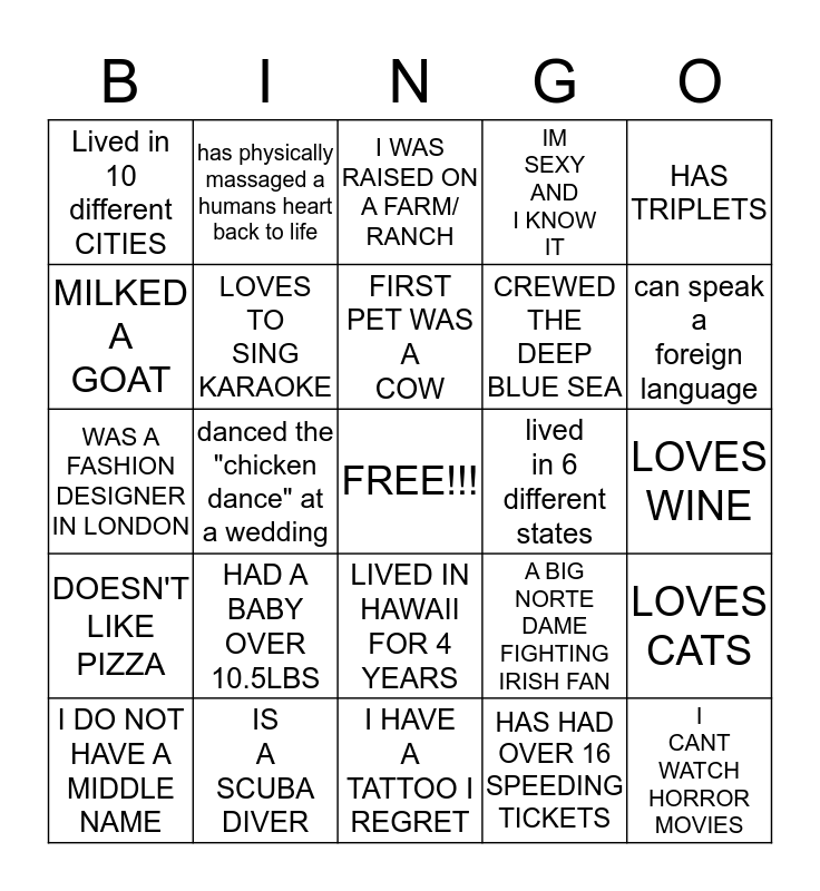 This bingo card has a free space and 24 words: HAD A BABY OVER 10.5LBS, IS A SCUBA DIVER, FIRST PET WAS A COW, I DO NOT HAVE A MIDDLE NAME, HAS TRIPLETS, Lived in 10 different CITIES, MILKED A GOAT, has physically massaged a humans heart back to life, lived in 6 different states, LIVED IN HAWAII FOR 4 YEARS, CREWED THE DEEP BLUE SEA, WAS A FASHION DESIGNER IN LONDON, A BIG NORTE DAME FIGHTING IRISH FAN, LOVES CATS, LOVES TO SING KARAOKE, HAS HAD OVER 16 SPEEDING TICKETS, LOVES WINE, I WAS RAISED ON A FARM/ RANCH, can speak a foreign language, danced the "chicken dance" at a wedding, I CANT WATCH HORROR MOVIES, DOESN'T LIKE PIZZA, IM SEXY AND I KNOW IT and I HAVE A TATTOO I REGRET.