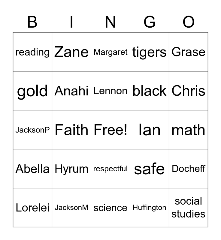 This bingo card has a free space and 33 words: Cahill, Aalyiah, Faith, Reyna, Abella, Anahi, Grase, Lorelei, Zane, Jordan, Lennon, Margaret, Georgie, Dexter, Ian, Chris, JacksonM, JacksonP, Hyrum, safe, respectful, responsible, reading, math, science, social studies, tigers, black, gold, Docheff, Marshall, Huffington and Brown.