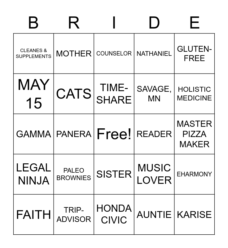 This bingo card has a free space and 34 words: FRED, AUNTIE, PRAYER WARRIOR, EXCELLENT WRITER, LEGAL NINJA, CATS, GLUTEN-FREE, FAITH, MOTHER, 007, TIME-SHARE, COUNSELOR, BEAUTIFUL SKIN, SEAMSTRESS, READER, HOLISTIC MEDICINE, TRIP-ADVISOR, GAMMA, PALEO BROWNIES, MUSIC LOVER, SISTER, GARDENER, CLEANES & SUPPLEMENTS, MASTER PIZZA MAKER, HONDA CIVIC, KARISE, NATHANIEL, ISLA, SAVAGE, MN, MAY 15, BLUE EARTH, MN, PANERA, EHARMONY and 1954.