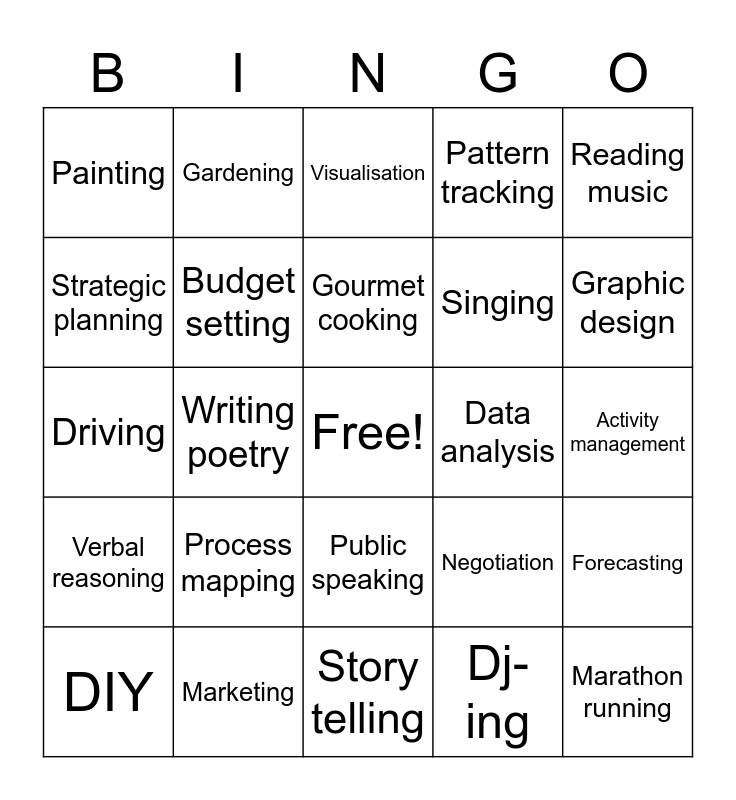 This bingo card has a free space and 25 words: Process mapping, Story telling, Gourmet cooking, DIY, Reading music, Painting, Strategic planning, Gardening, Data analysis, Public speaking, Singing, Driving, Negotiation, Forecasting, Budget setting, Yodelling, Activity management, Visualisation, Graphic design, Writing poetry, Marathon running, Marketing, Verbal reasoning, Pattern tracking and Dj-ing.