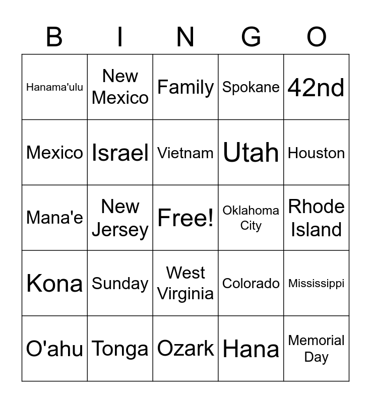 This bingo card has a free space and 144 words: Alabama, Alaska, Arizona, Arkansas, California, Colorado, Connecticut, Delaware, Florida, Indiana, Iowa, Kansas, Kentucky, Louisiana, Maine, Maryland, Massachusettes, Michegan, Minnesota, Georgia, Hawaii, Mississippi, Nebraska, Nevada, New Hampshire, New Jersey, New Mexico, New York, North Carolina, North Dakota, Ohio, Oklahoma, Oregon, Rhode Island, South carolina, South Dakota, Tennessee, Texas, Utah, Vermont, Virginia, Washinton, West Virginia, Wisconsin, Idaho, Illinois, Missouri, Montana, Pennsylvania, Wyoming, Maui, Big Island, O'ahu, Kaua'i, Moloka'i, Lana'i, Kaho'olawe, Kahului, Kihei, Wailuku, Lahaina, Hana, Kula, Paia, Honoka'a, Kona, Hilo, Windward, Honolulu, Ele'ele, Kapa'a, Hanama'ulu, Mana'e, Maunaloa, Moloka'i Up-Country, Eagle River, Wasilla, Lebanon, Spokane, Tacoma, Salem, Antioch, Phoenix, Dallas, Houston, Enid, Oklahoma City, Cleburne, Ozark, Springfield, Branson, Celina, Tahit, Tonga, New Zealand, Fiji, Philippines, Marshall Islands, Brazil, Chile, Mexico, Canada, Spain, Italy, Vietnam, Malaysia, Japan, Mozambique, England, Israel, People Conference, Family, King's Collective, 42nd, Memorial Day, New Friends, Old Friends, People, BJ Putnam, Jabin Chavez, Celebration Showcase, Power, Purpose, Extensions, King's Kids 4.5, King's Kids 1.2.3, Giving, Sharing, Minister Caleb, Minister Kelly, Regan, Kaylynne, Aunt Cindy, Stevie, Derrick, Janelle, Luxcious, Friday, Saturday, Sunday, Worship, Minister James, Happy and Joy.