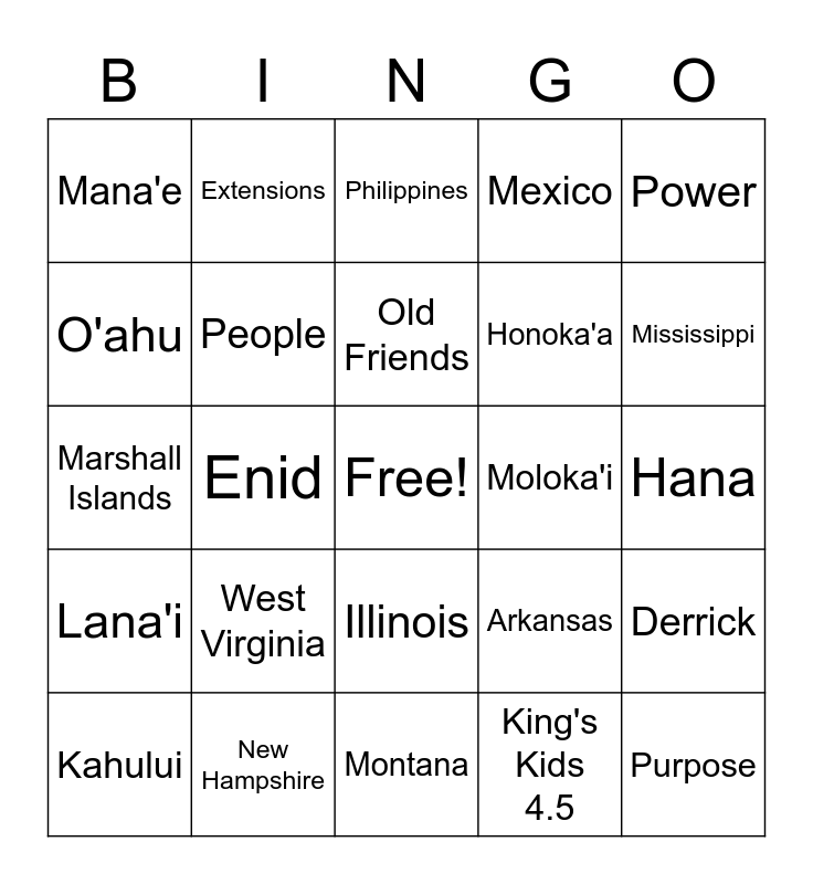 This bingo card has a free space and 144 words: 42nd, Alabama, Alaska, Antioch, Arizona, Arkansas, Aunt Cindy, Big Island, BJ Putnam, Branson, Brazil, California, Canada, Celebration Showcase, Celina, Chile, Cleburne, Colorado, Connecticut, Dallas, Delaware, Derrick, Eagle River, Ele'ele, England, Enid, Extensions, Family, Fiji, Florida, Friday, Georgia, Giving, Hana, Hanama'ulu, Happy, Hawaii, Hilo, Honoka'a, Honolulu, Houston, Idaho, Illinois, Indiana, Iowa, Israel, Italy, Jabin Chavez, Janelle, Japan, Joy, Kaho'olawe, Kahului, Kansas, Kapa'a, Kaua'i, Kaylynne, Kentucky, Kihei, King's Collective, King's Kids 1.2.3, King's Kids 4.5, Kona, Kula, Lahaina, Lana'i, Lebanon, Louisiana, Luxcious, Maine, Malaysia, Mana'e, Marshall Islands, Maryland, Massachusettes, Maui, Maunaloa, Memorial Day, Mexico, Michigan, Minister Caleb, Minister James, Minister Kelly, Minnesota, Mississippi, Missouri, Moloka'i, Moloka'i Up-Country, Montana, Mozambique, Nebraska, Nevada, New Friends, New Hampshire, New Jersey, New Mexico, New York, New Zealand, North Carolina, North Dakota, O'ahu, Ohio, Oklahoma, Oklahoma City, Old Friends, Oregon, Ozark, Paia, Pennsylvania, People, People Conference, Philippines, Phoenix, Power, Purpose, Regan, Rhode Island, Salem, Saturday, Sharing, South Carolina, South Dakota, Spain, Spokane, Springfield, Stevie, Sunday, Tacoma, Tahiti, Tennessee, Texas, Tonga, Utah, Vermont, Vietnam, Virginia, Wailuku, Washington, Wasilla, West Virginia, Windward, Wisconsin, Worship and Wyoming.