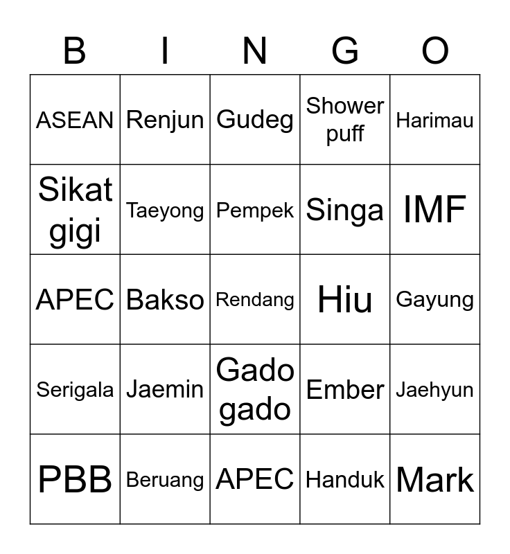 This bingo card has a free space and 24 words: Jaemin, Beruang, Pempek, PBB, Harimau, ASEAN, Sikat gigi, Renjun, Hiu, Gado gado, Singa, APEC, Ember, Jaehyun, Taeyong, Handuk, Gayung, Gudeg, IMF, Bakso, Mark, Serigala, Shower puff and APEC.