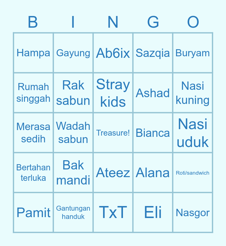 This bingo card has a free space and 24 words: Pamit, Bak mandi, Stray kids, Eli, Buryam, Hampa, Gayung, Ab6ix, Bianca, Nasi uduk, Merasa sedih, Rak sabun, Alana, Roti/sandwich, Rumah singgah, Gantungan handuk, TxT, Sazqia, Nasi kuning, Bertahan terluka, Wadah sabun, Ateez, Ashad and Nasgor.