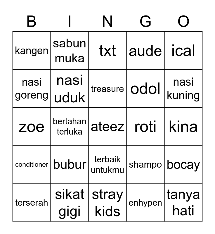 This bingo card has a free space and 24 words: bubur, sikat gigi, treasure, terserah, ical, kangen, nasi goreng, sabun muka, roti, terbaik untukmu, odol, zoe, shampo, bocay, nasi uduk, enhypen, kina, txt, nasi kuning, bertahan terluka, tanya hati, conditioner, aude and stray kids.