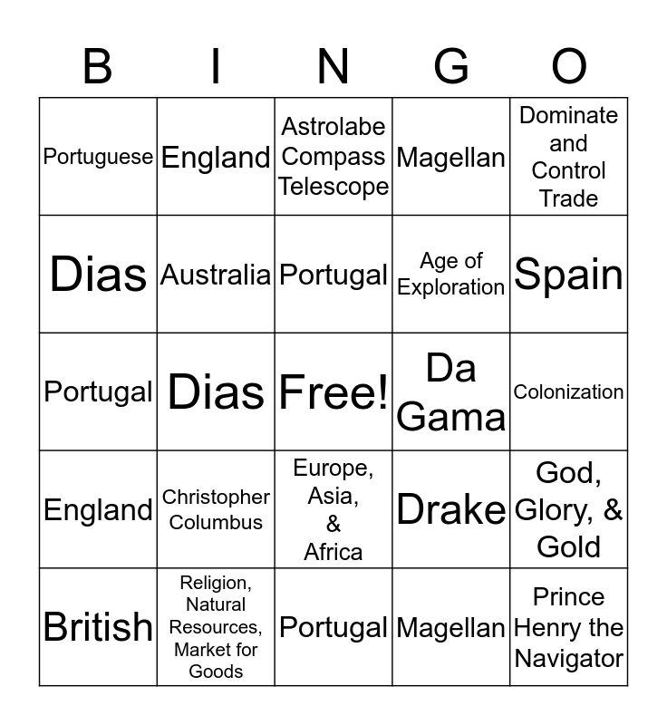 This bingo card has a free space and 24 words: Christopher Columbus, Religion, Natural Resources, Market for Goods, Portugal, British, Dominate and Control Trade, Portuguese, Dias, England, Da Gama, Europe, Asia, & Africa, Age of Exploration, Portugal, Drake, God, Glory, & Gold, Australia, Magellan, Colonization, Astrolabe Compass Telescope, Spain, Dias, Prince Henry the Navigator, England, Magellan and Portugal.