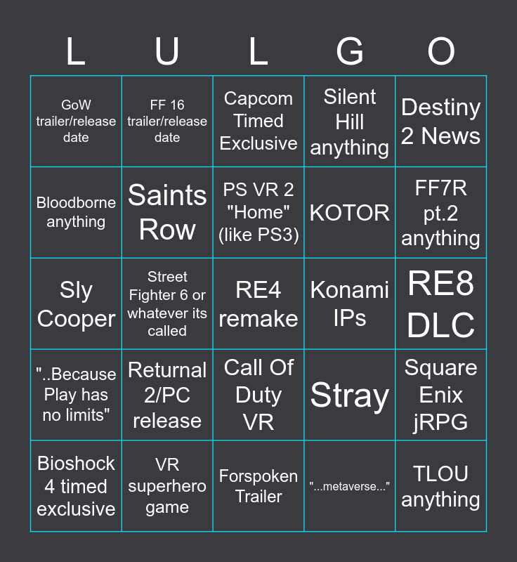 This bingo card has 25 words: Returnal 2/PC release, Forspoken Trailer, PS VR 2 "Home" (like PS3), Bioshock 4 timed exclusive, Destiny 2 News, GoW trailer/release date, Bloodborne anything, FF 16 trailer/release date, Konami IPs, Call Of Duty VR, KOTOR, Sly Cooper, Stray, Square Enix jRPG, Saints Row, TLOU anything, RE8 DLC, Capcom Timed Exclusive, FF7R pt.2 anything, Street Fighter 6 or whatever its called, RE4 remake, VR superhero game, "..Because Play has no limits", Silent Hill anything and "...metaverse...".
