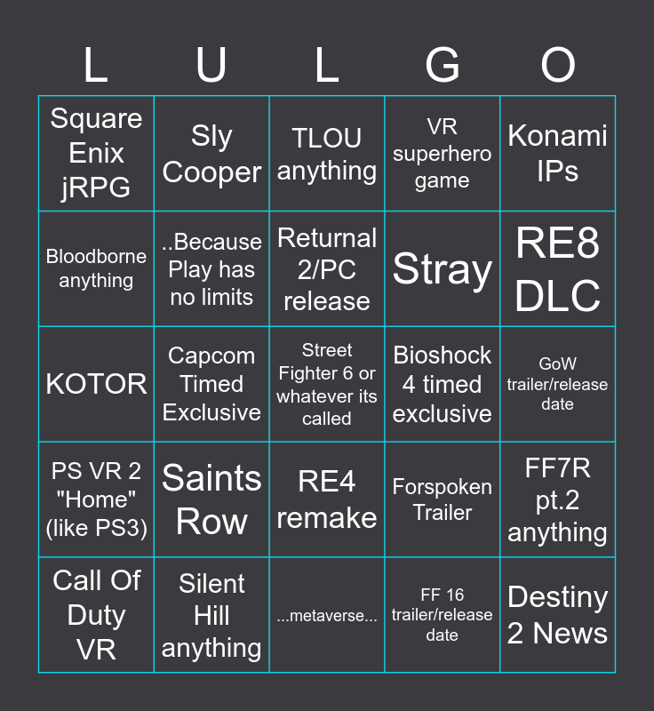 This bingo card has 25 words: Saints Row, ...metaverse..., Returnal 2/PC release, Call Of Duty VR, Konami IPs, Square Enix jRPG, Bloodborne anything, Sly Cooper, Bioshock 4 timed exclusive, RE4 remake, Stray, KOTOR, Forspoken Trailer, FF7R pt.2 anything, ..Because Play has no limits, Destiny 2 News, GoW trailer/release date, TLOU anything, RE8 DLC, Capcom Timed Exclusive, Street Fighter 6 or whatever its called, Silent Hill anything, PS VR 2 "Home" (like PS3), VR superhero game and FF 16 trailer/release date.