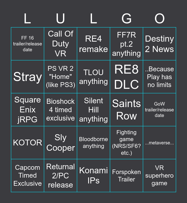 This bingo card has 25 words: Sly Cooper, Konami IPs, TLOU anything, Capcom Timed Exclusive, Destiny 2 News, FF 16 trailer/release date, Stray, Call Of Duty VR, Saints Row, Bloodborne anything, RE8 DLC, Square Enix jRPG, Fighting game (NRS/SF6?etc.), ...metaverse..., PS VR 2 "Home" (like PS3), VR superhero game, GoW trailer/release date, RE4 remake, ..Because Play has no limits, Bioshock 4 timed exclusive, Silent Hill anything, Returnal 2/PC release, KOTOR, FF7R pt.2 anything and Forspoken Trailer.