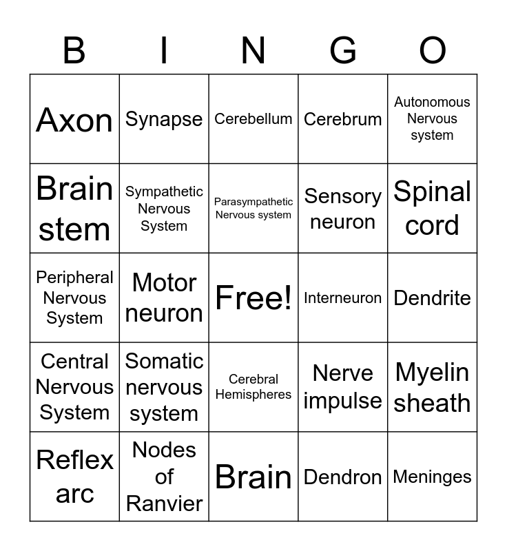 This bingo card has a free space and 24 words: Somatic nervous system, Nodes of Ranvier, Parasympathetic Nervous system, Reflex arc, Autonomous Nervous system, Axon, Brain stem, Synapse, Interneuron, Cerebral Hemispheres, Sensory neuron, Peripheral Nervous System, Nerve impulse, Myelin sheath, Sympathetic Nervous System, Dendron, Dendrite, Cerebellum, Spinal cord, Motor neuron, Meninges, Central Nervous System, Cerebrum and Brain.