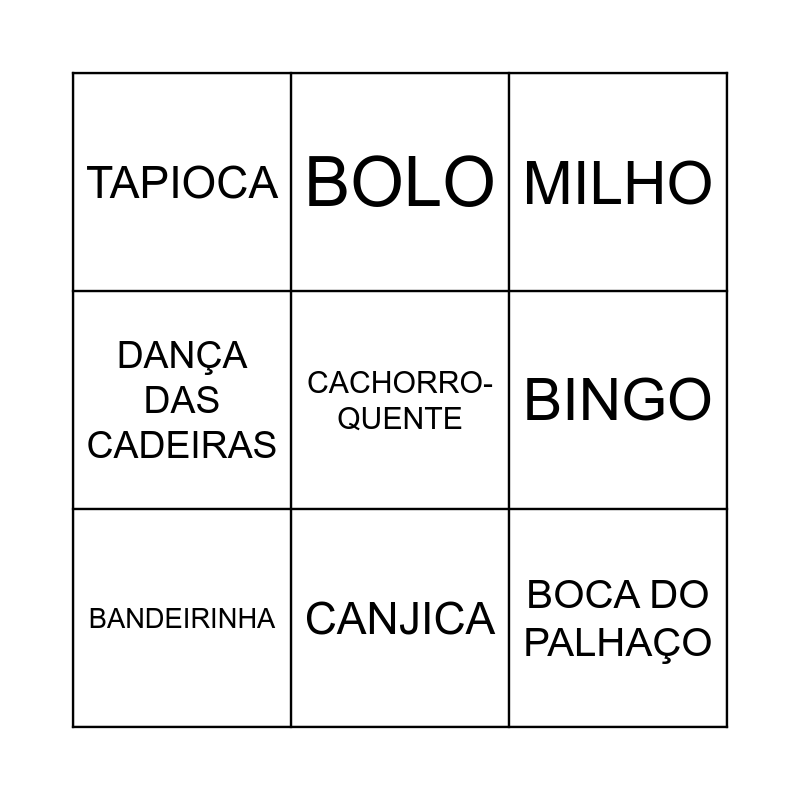 This bingo card has 29 words: PAMONHA, AMENDOIM, ALGODÃO-DOCE, MAÇÃ-DO-AMOR, TAPIOCA, MILHO, BANDEIRINHA, QUADRILHA, PESCARIA, CHAPÉU, PIPOCA, SANFONA, VIOLA, FOGUEIRA, BALÃO, SÃO JOÃO, PRENDA, PASTEL, CACHORRO-QUENTE, QUENTÃO, ESPANTALHO, CORREIO ELEGANTE, BOCA DO PALHAÇO, BINGO, DANÇA DAS CADEIRAS, BOLO, CHURRASCO, CANJICA and PAÇOCA.