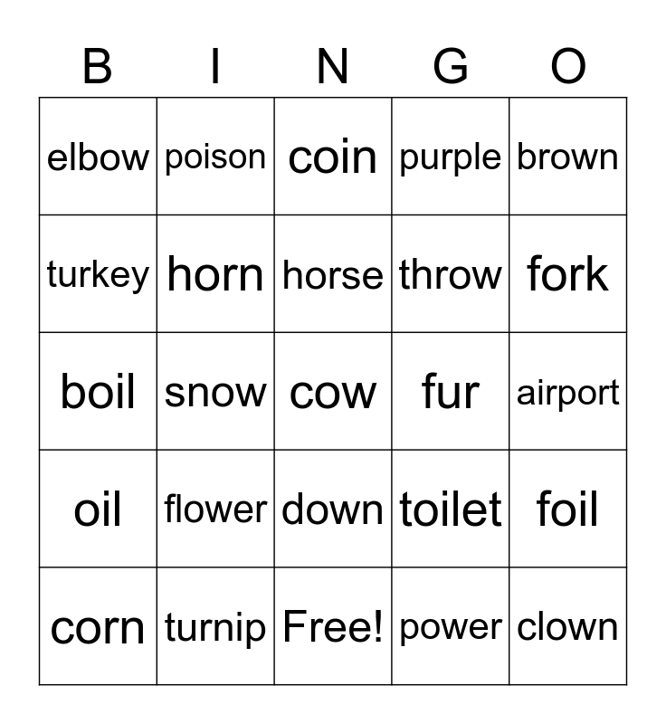 This bingo card has 1 images and 26 words: Free!, turkey, turnip, horse, purple, brown, oil, horn, surf, fur, fork, corn, flower, cow, power, airport, elbow, snow, coin, toilet, foil, boil, poison, down, throw and clown.