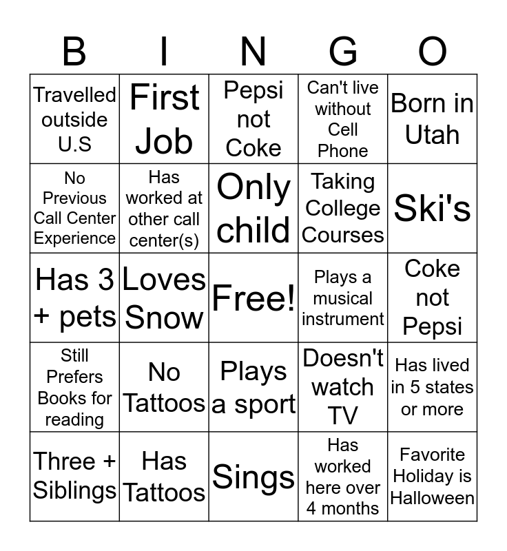 This bingo card has a free space and 24 words: No Tattoos, Has Tattoos, Only child, Three + Siblings, Born in Utah, Travelled outside U.S, No Previous Call Center Experience, First Job, Plays a musical instrument, Plays a sport, Taking College Courses, Has 3 + pets, Doesn't watch TV, Has lived in 5 states or more, Has worked at other call center(s), Has worked here over 4 months, Coke not Pepsi, Pepsi not Coke, Ski's, Loves Snow, Favorite Holiday is Halloween, Still Prefers Books for reading, Can't live without Cell Phone and Sings.