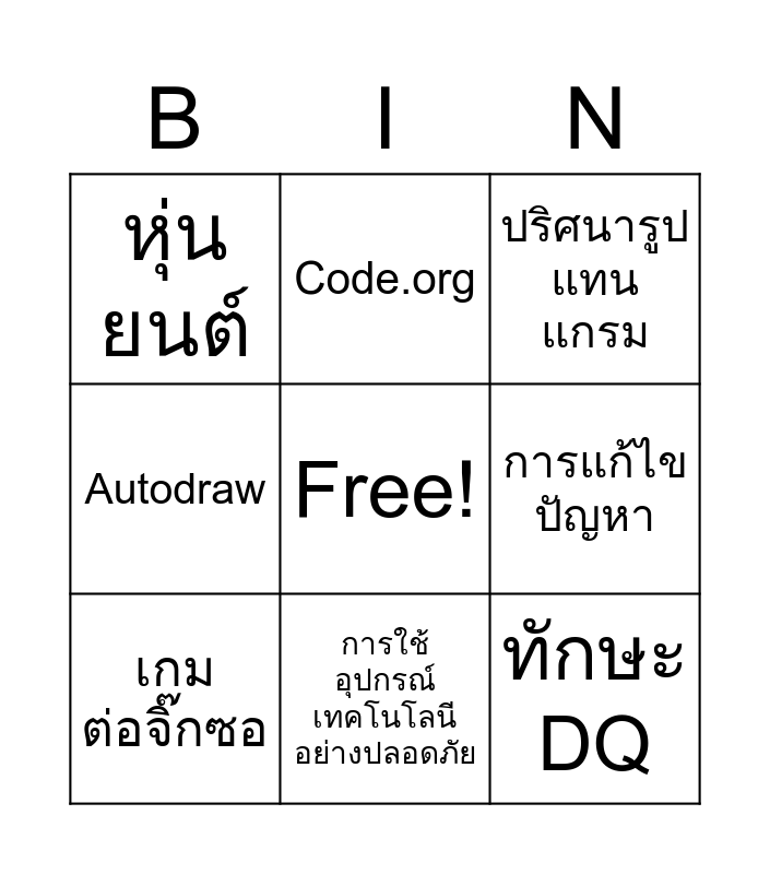 This bingo card has a free space and 8 words: Autodraw, Code.org, การแก้ไขปัญหา, เกม ต่อจิ๊กซอ, ปริศนารูปแทน แกรม, หุ่นยนต์, การใช้ อุปกรณ์ เทคโนโลนีอย่างปลอดภัย and ทักษะ DQ.