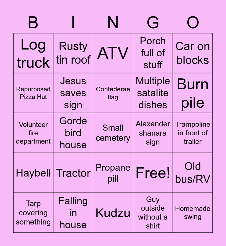 This bingo card has 25 words: Tractor, Kudzu, Confederae flag, Tarp covering something, Car on blocks, Log truck, Repurposed Pizza Hut, Rusty tin roof, Alaxander shanara sign, Propane pill, Multiple satalite dishes, Volunteer fire department, Free!, Old bus/RV, Jesus saves sign, Homemade swing, Trampoline in front of trailer, ATV, Burn pile, Gorde bird house, Small cemetery, Falling in house, Haybell, Porch full of stuff and Guy outside without a shirt.