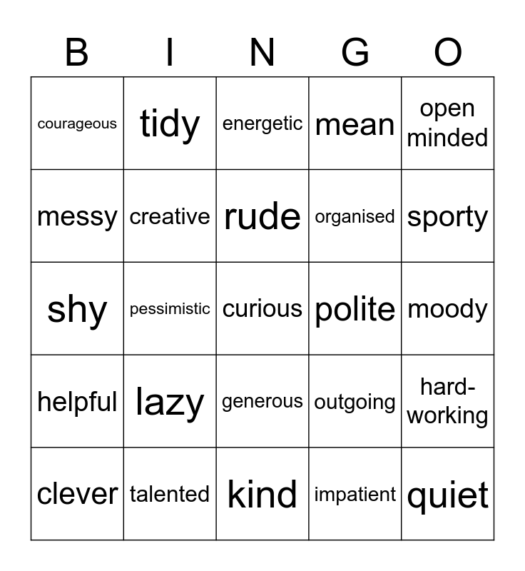 This bingo card has 25 words: lazy, kind, rude, clever, open minded, courageous, messy, tidy, polite, generous, organised, shy, outgoing, hard-working, creative, quiet, moody, energetic, sporty, pessimistic, curious, talented, helpful, mean and impatient.