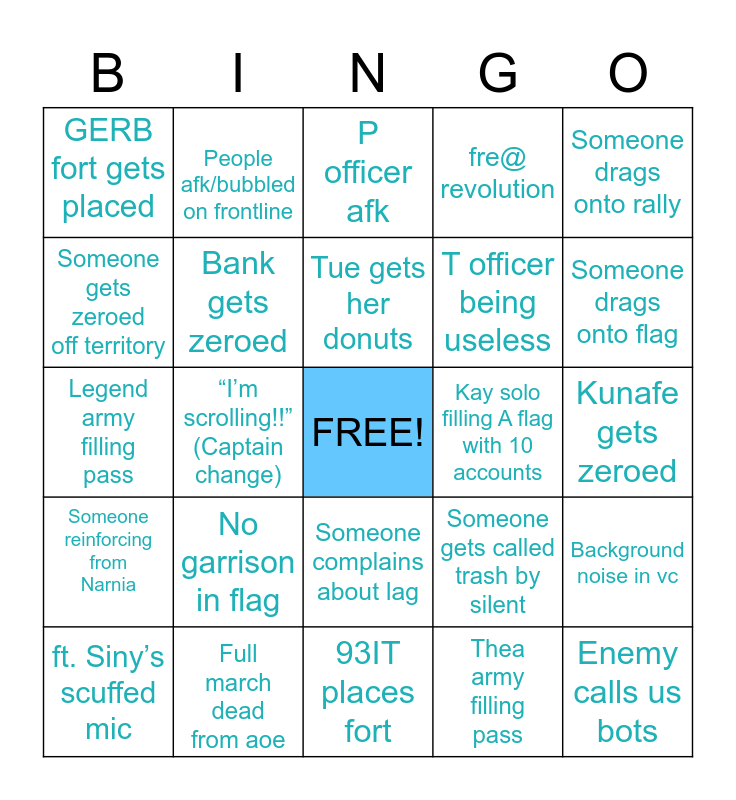 This bingo card has a free space and 30 words: Full march dead from aoe, Rup slum filling pass, “I’m scrolling!!” (Captain change), Rally without swapping alliance, GERB fort gets placed, P officer afk, Bank gets zeroed, Someone complains about lag, Kay solo filling A flag with 10 accounts, 93IT places fort, Kunafe gets zeroed, Enemy calls us bots, Thea army filling pass, Troll from other kd in KC, Someone drags onto flag, Enemy mentions 846, Someone gets called trash by silent, Someone reinforcing from Narnia, No garrison in flag, Someone drags onto rally, Legend army filling pass, Someone freaks out about anchor, People afk/bubbled on frontline, T officer being useless, Someone gets zeroed off territory, fre@ revolution, Background noise in vc, ft. Siny’s scuffed mic, Tue gets her donuts and Tue doesn’t get her donuts.