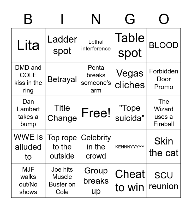 This bingo card has a free space and 29 words: MJF walks out/No shows, Uses another wrestler's finisher, Title Change, Dan Hausen curse, Lita, Lethal interference, Betrayal, Top rope to the outside, "Tope suicida", Joe hits Muscle Buster on Cole, The Wizard uses a Fireball, SCU reunion, Group breaks up, Cheat to win, Forbidden Door Promo, ____ is ALL ELITE, Celebrity in the crowd, WWE is alluded to, BLOOD, Dan Lambert takes a bump, KENNNYYYYY, Poker puns, Vegas cliches, DMD and COLE kiss in the ring, Table spot, Ladder spot, Skin the cat, Penta breaks someone's arm and BOTCH.