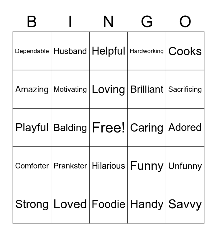 This bingo card has a free space and 50 words: Griller, Savvy, Napper, Foodie, Prankster, Driver, Husband, Cool, Amazing, Smart, Motivating, Hardworking, Unfunny, Funny, Inspiring, Brave, Loving, Caring, Strong, Cooks, Balding, Handy, Dependable, Brilliant, Intelligent, Protecting, Sacrificing, Guiding, Helpful, Hilarious, Busy, Clever, Coaching, Devoted, Loved, Nurturing, Mentor, Hero, Ancient, Adored, Handsome, Silly, Goofy, Modest, Strong, Playful, Fixer-upper, Patient, Comforter and मर्द.