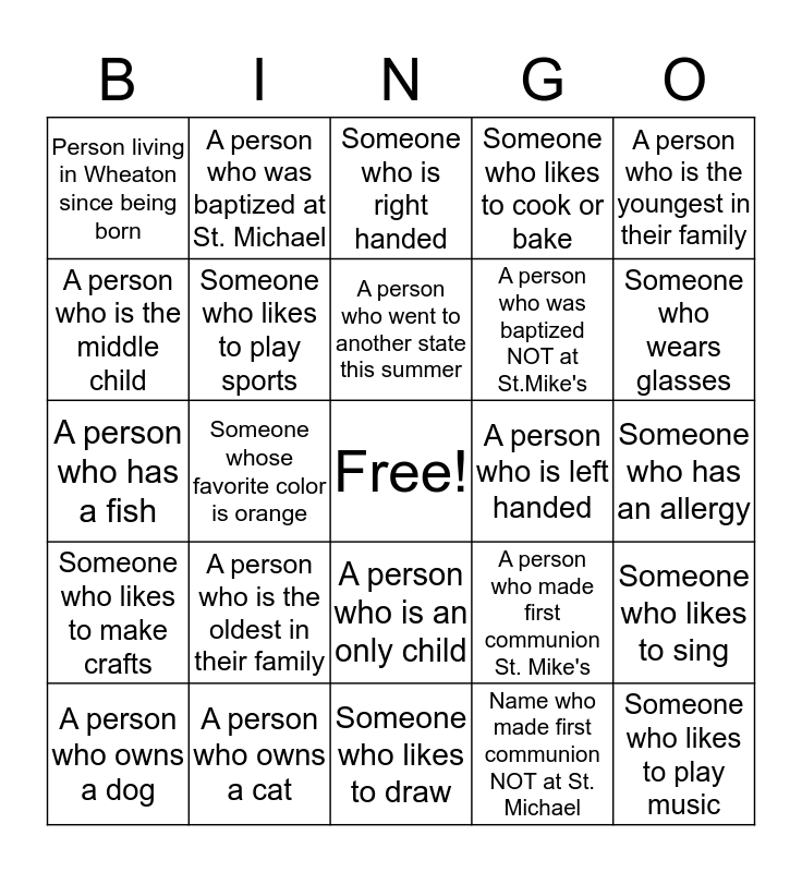 This bingo card has a free space and 24 words: A person who is the oldest in their family, A person who owns a cat, A person who went to another state this summer, A person who owns a dog, A person who is the youngest in their family, Person living in Wheaton since being born, A person who is the middle child, A person who was baptized at St. Michael, A person who is left handed, A person who is an only child, A person who was baptized NOT at St.Mike's, A person who has a fish, A person who made first communion St. Mike's, Someone who likes to sing, Someone who likes to play sports, Name who made first communion NOT at St. Michael, Someone who has an allergy, Someone who is right handed, Someone who wears glasses, Someone whose favorite color is orange, Someone who likes to play music, Someone who likes to make crafts, Someone who likes to cook or bake and Someone who likes to draw.