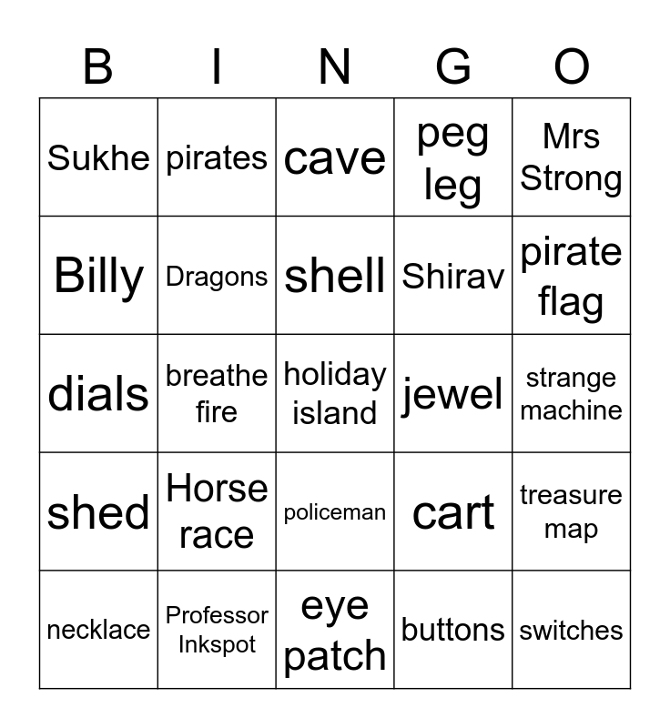 This bingo card has a free space and 24 words: Horse race, Professor Inkspot, shell, necklace, Mrs Strong, Sukhe, Billy, pirates, jewel, policeman, Shirav, dials, cart, treasure map, Dragons, buttons, strange machine, cave, pirate flag, breathe fire, switches, shed, peg leg and eye patch.